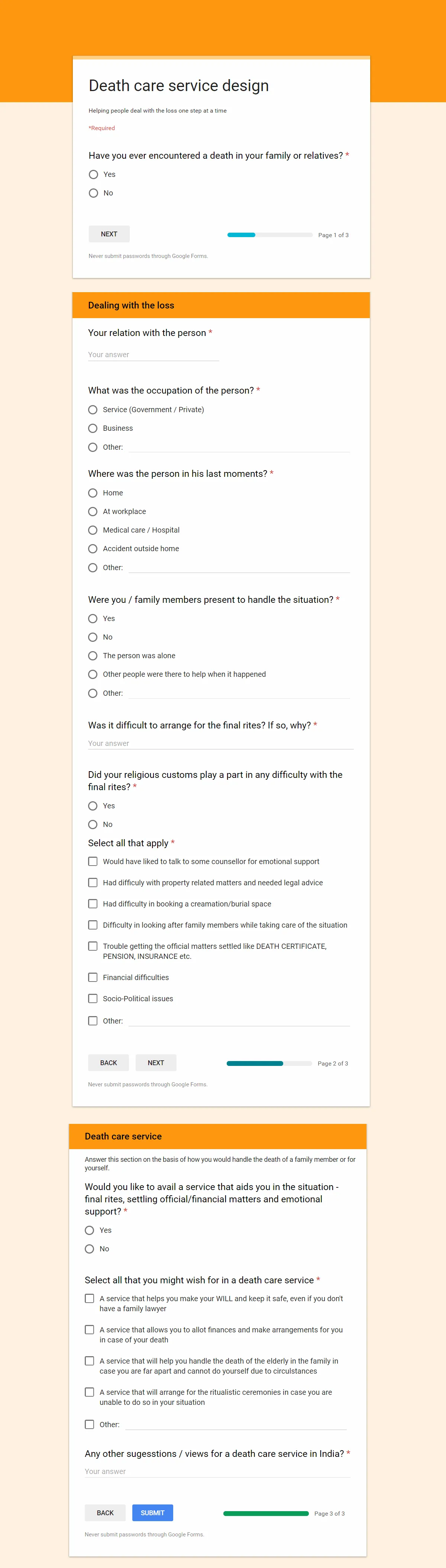 Before proceeding further, I wanted to know what people, who have dealt with death in the family or otherwise, had to say about their experiences in terms of dealing with different stakeholders and the idea of a death-care service. I circulated a survey in my circles and had received quite a response.
